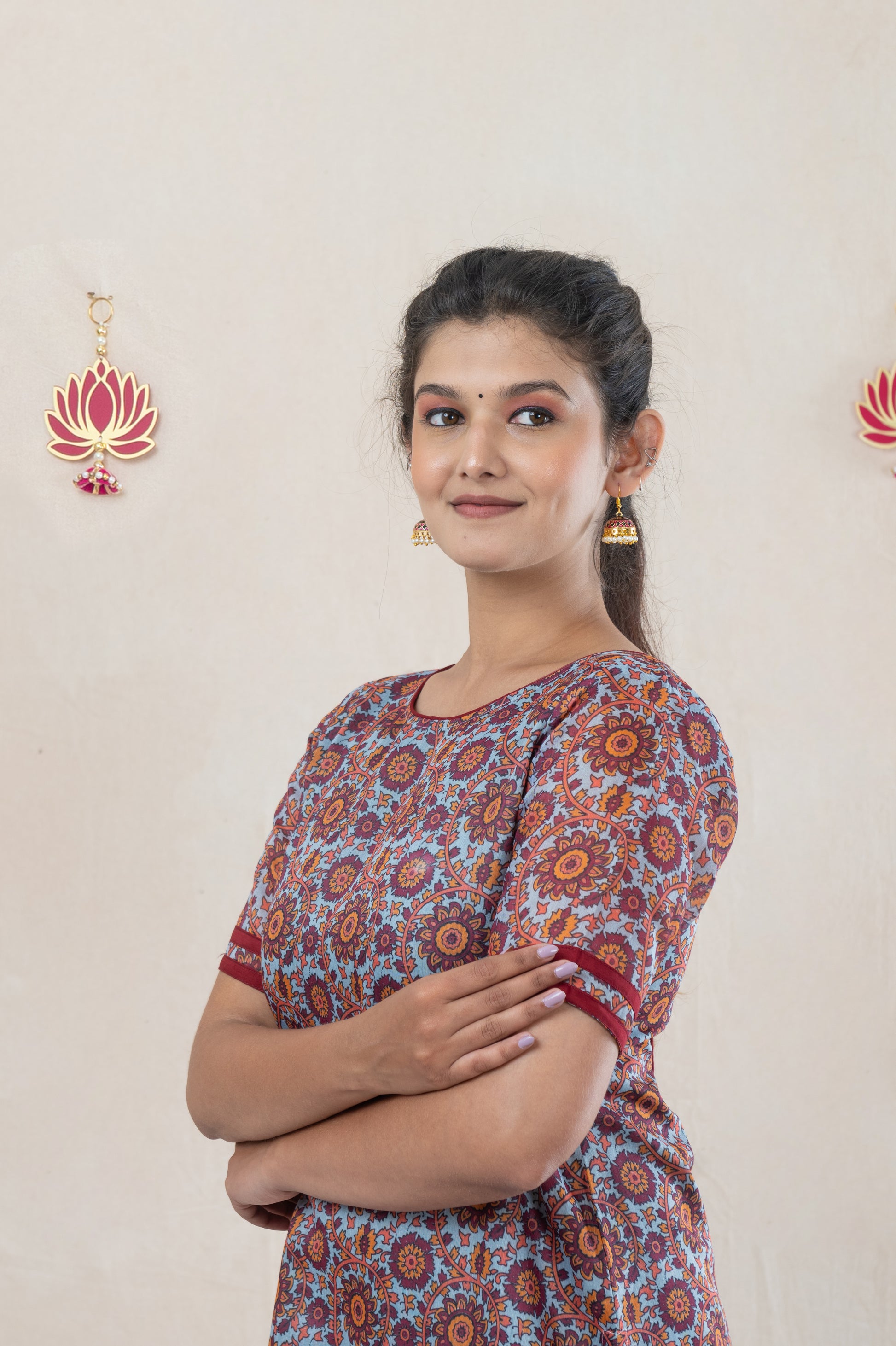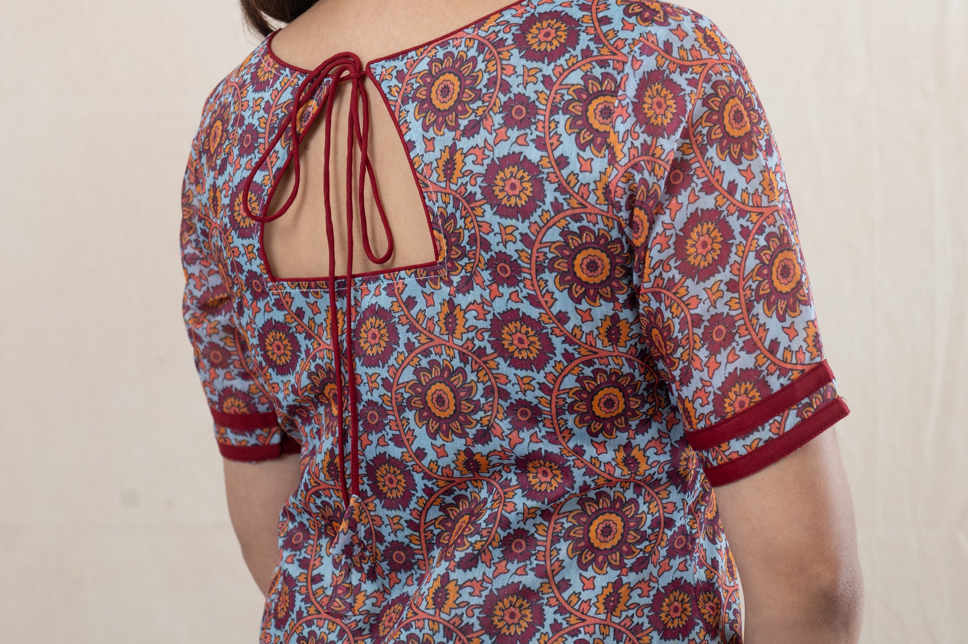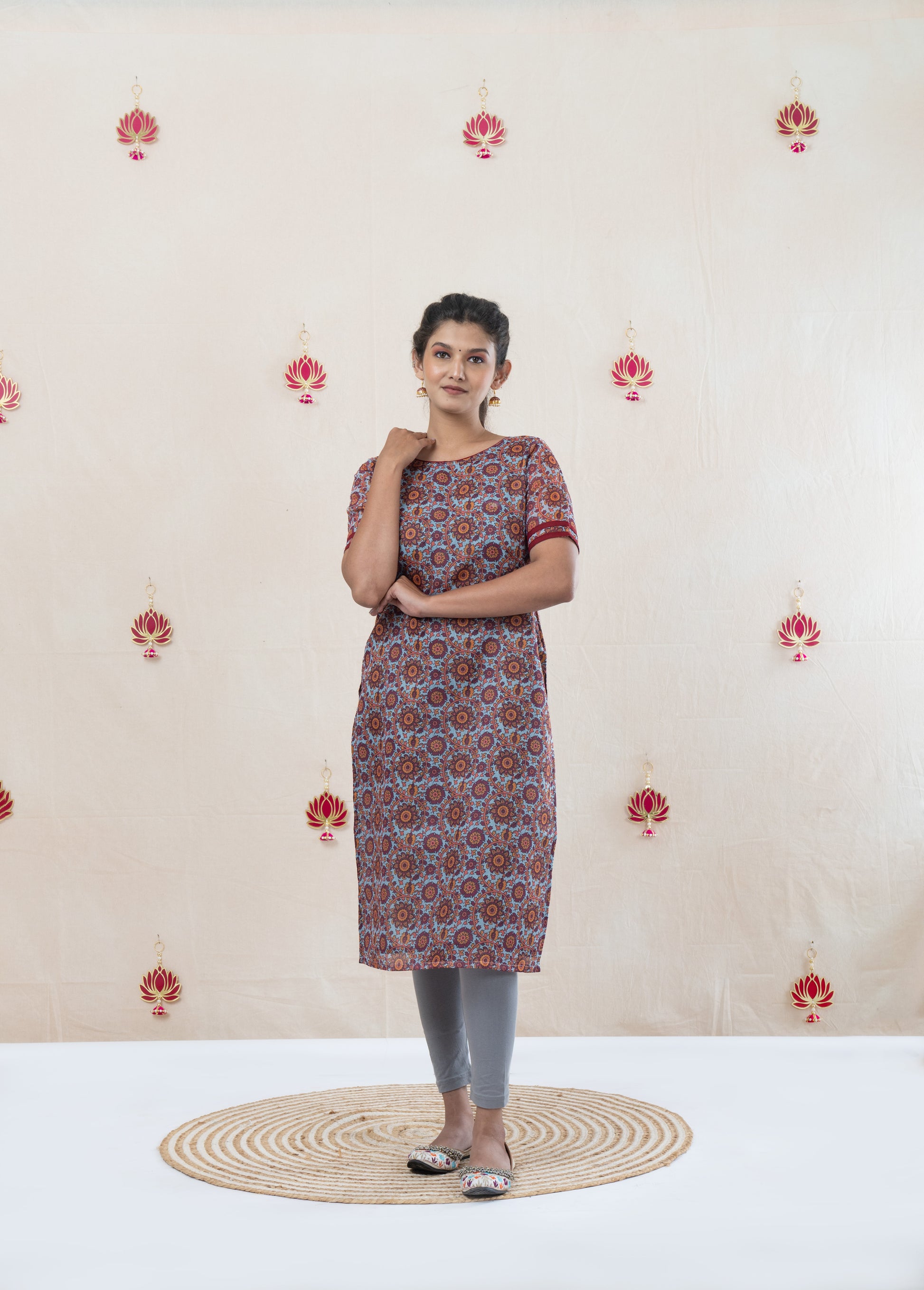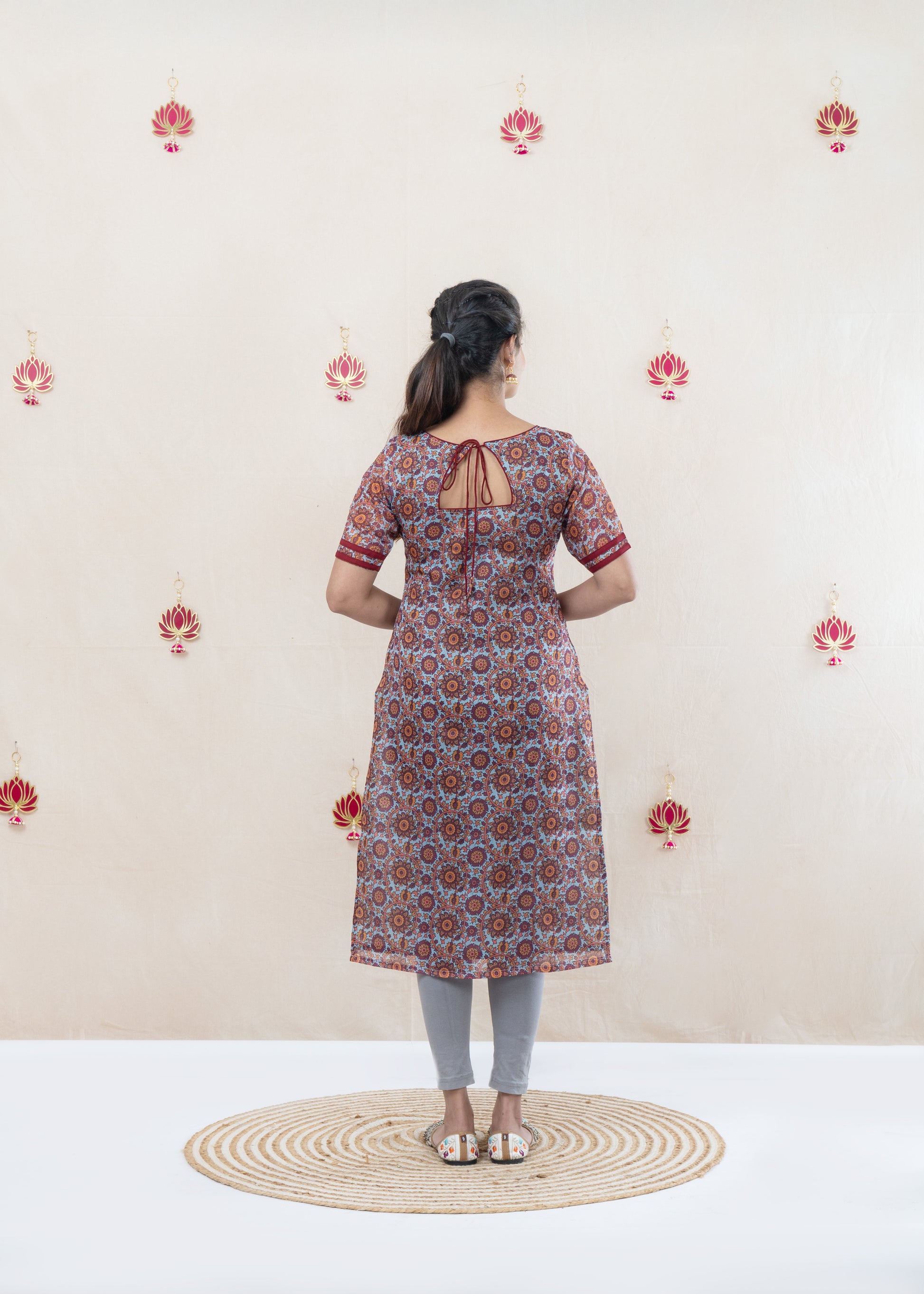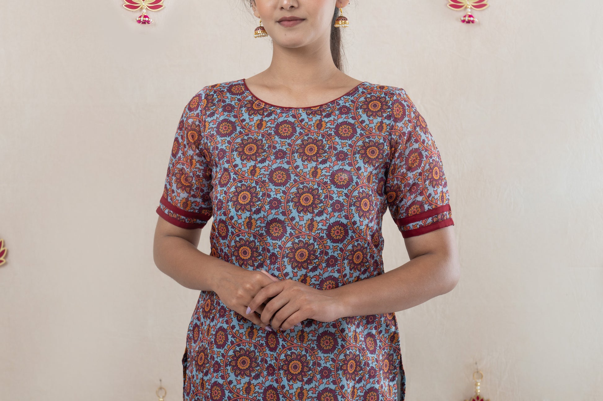 Look super-smart in this all-over printed Chanderi kurta. Featuring a vibrant floral print with contrast maroon piping and an eye-catching back dori, this piece will give you an ethnic-chic vibe that's sure to turn heads! You'll love this one-of-a-kind look!