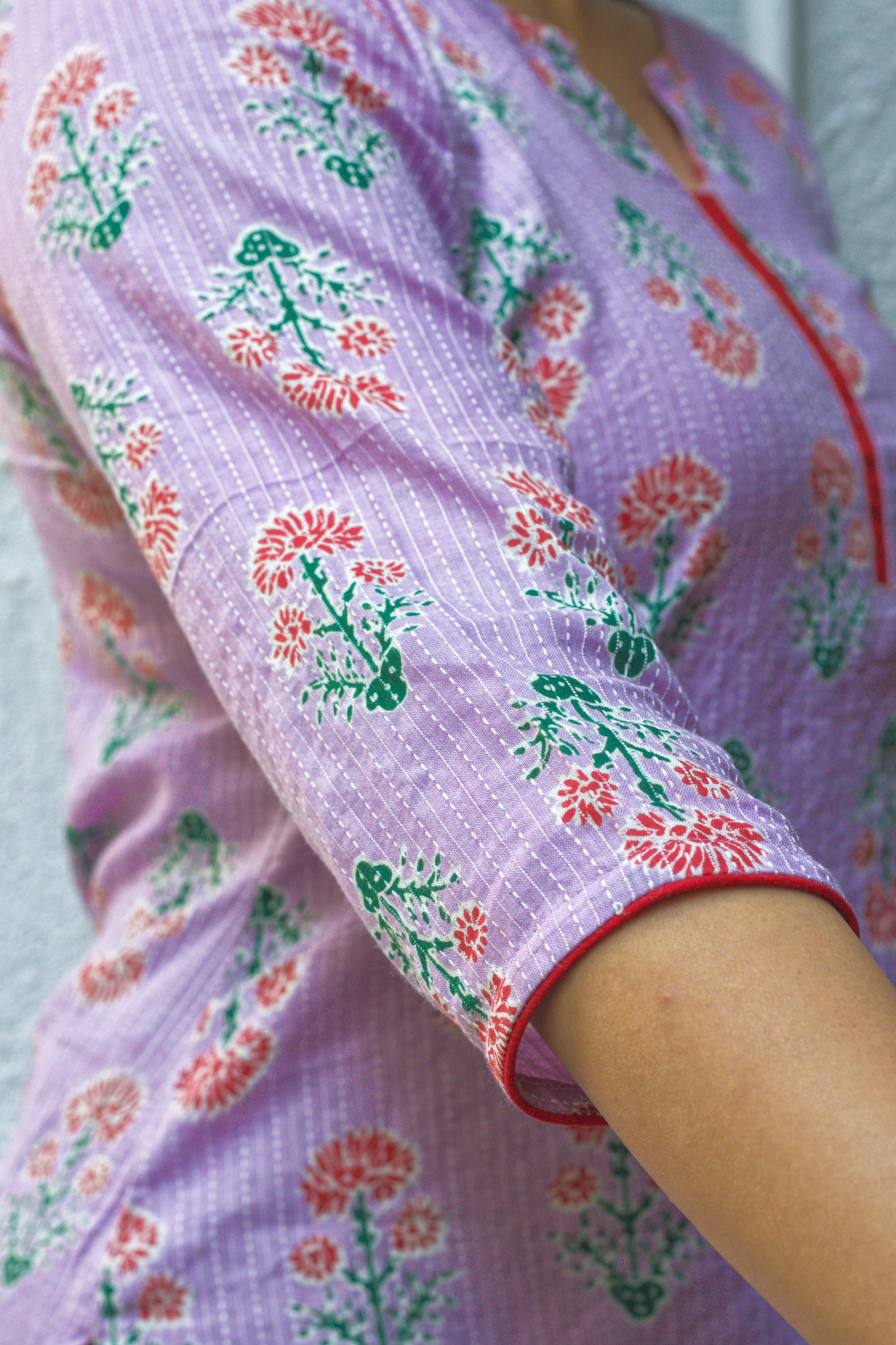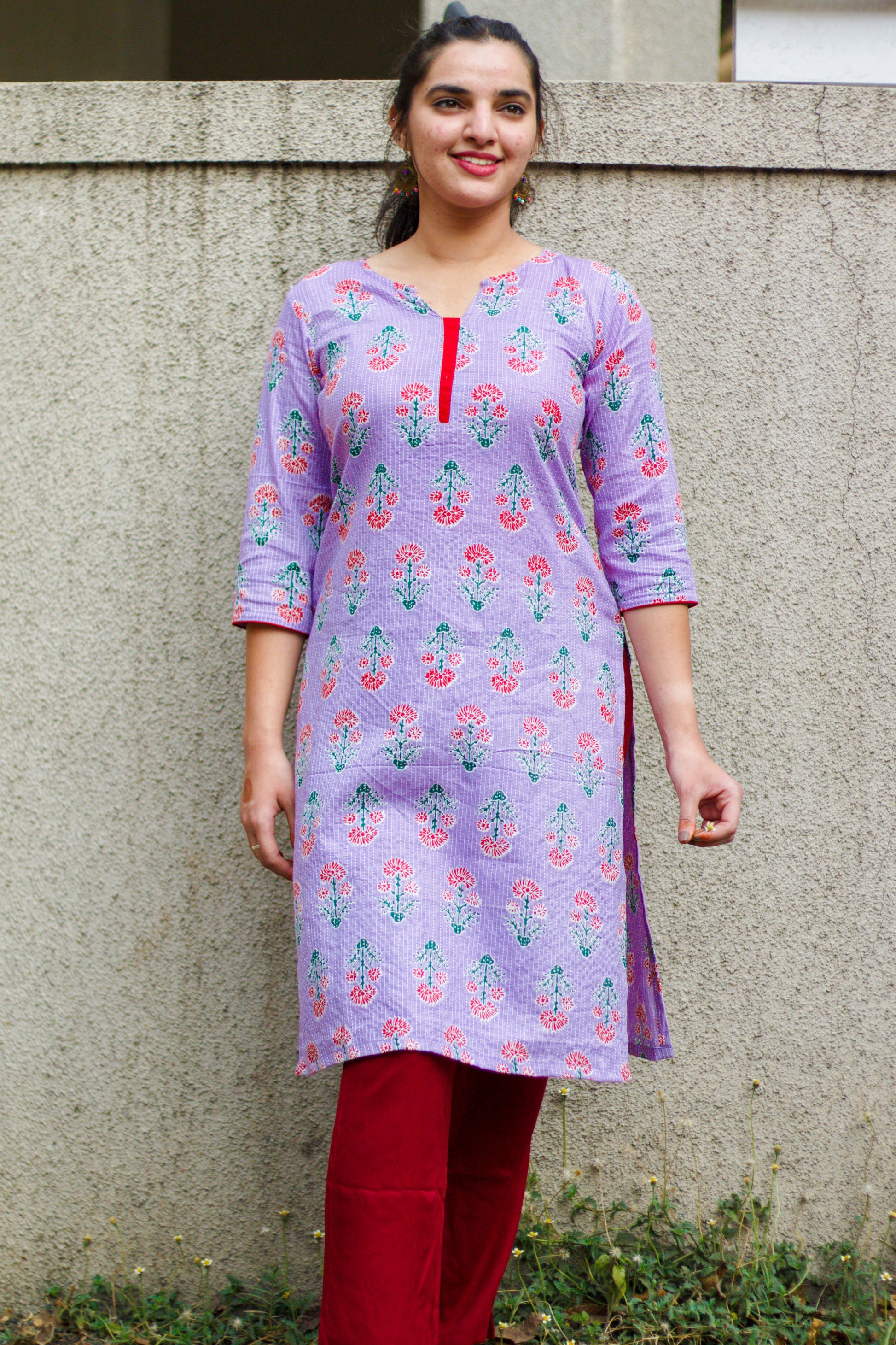 This kurta features a floral design with maroon accents on the sleeves and neckline, adding depth to the overall style. It is also lightweight and comfortable to wear.