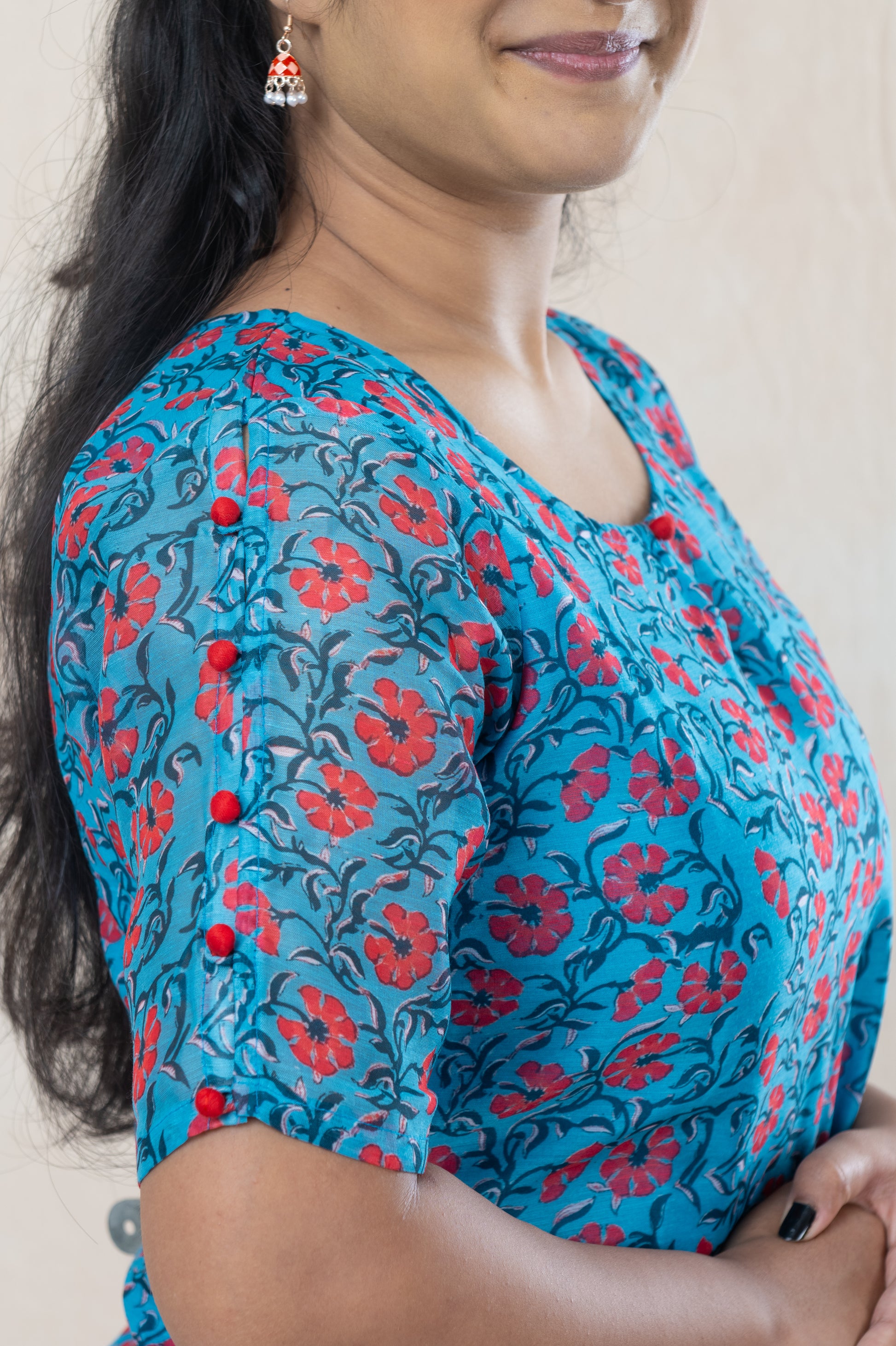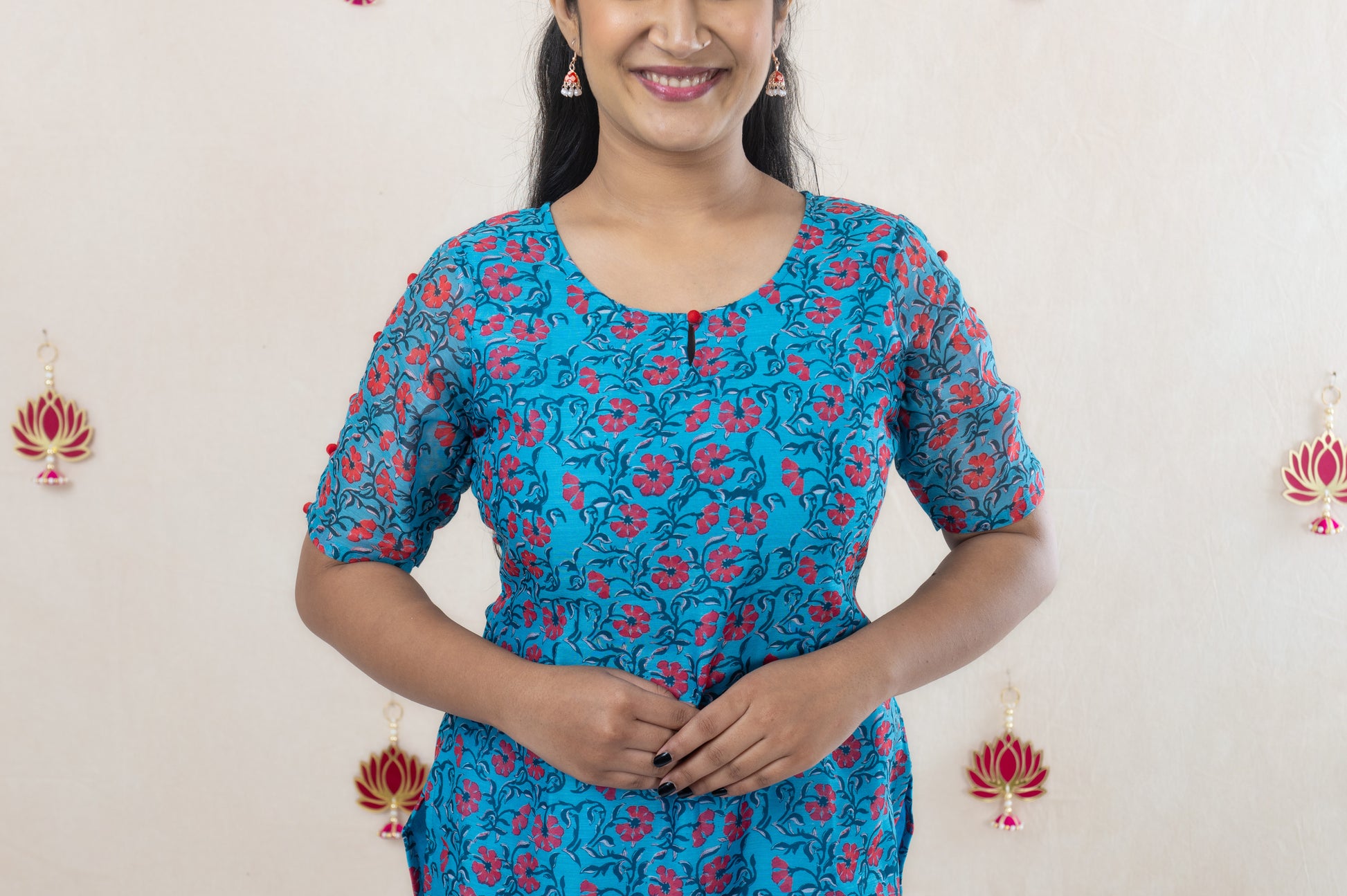 Be the life of the festive season in this bright blue chanderi kurta with contrasting floral print and sleeve potli button detailing! Celebrate Diwali in style with this elegant and unique number. Now THAT'S something to get excited about!