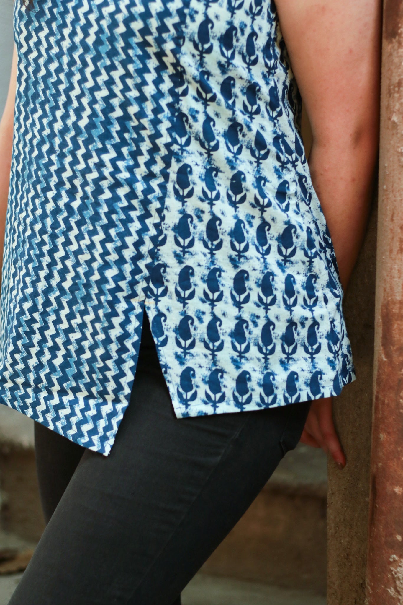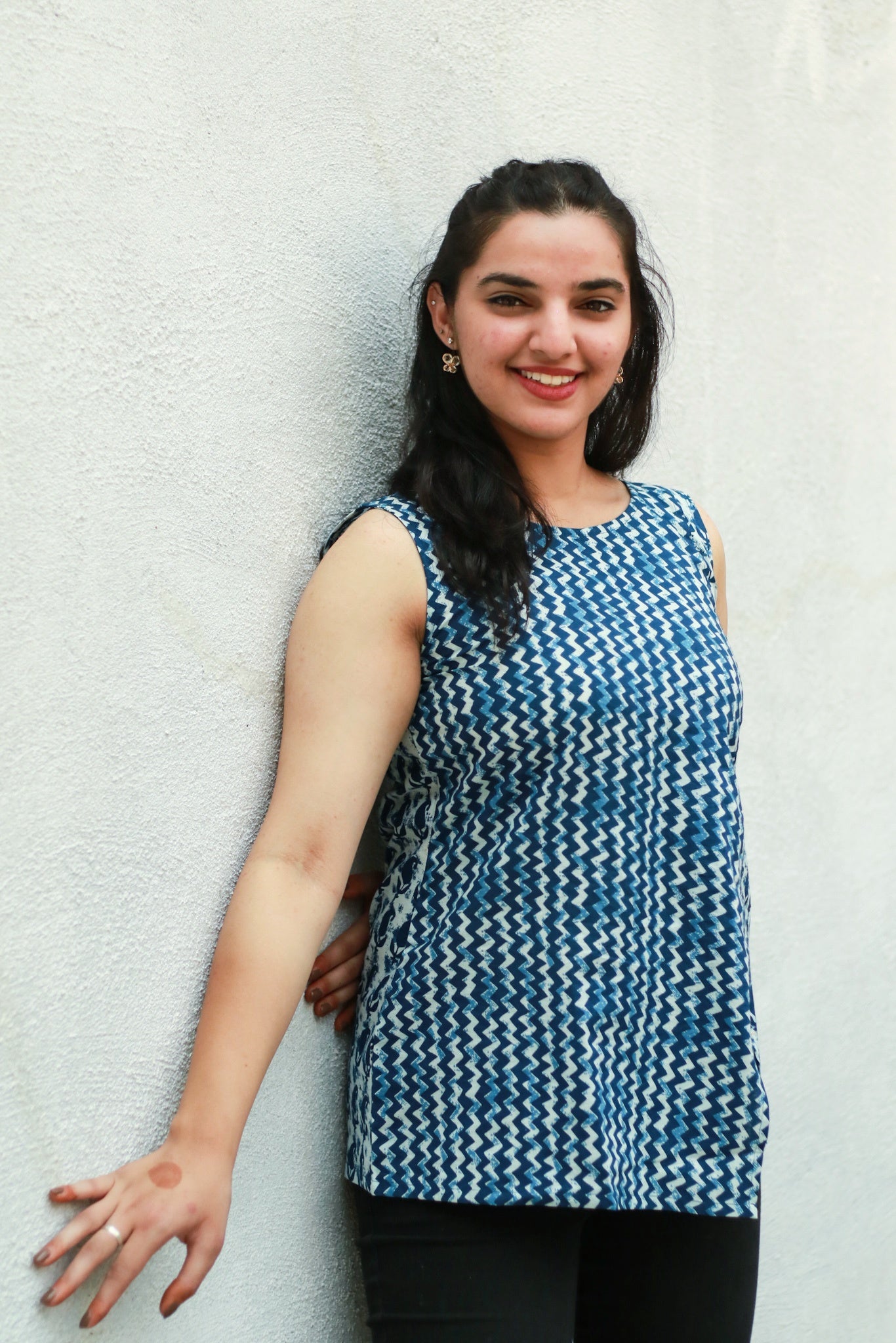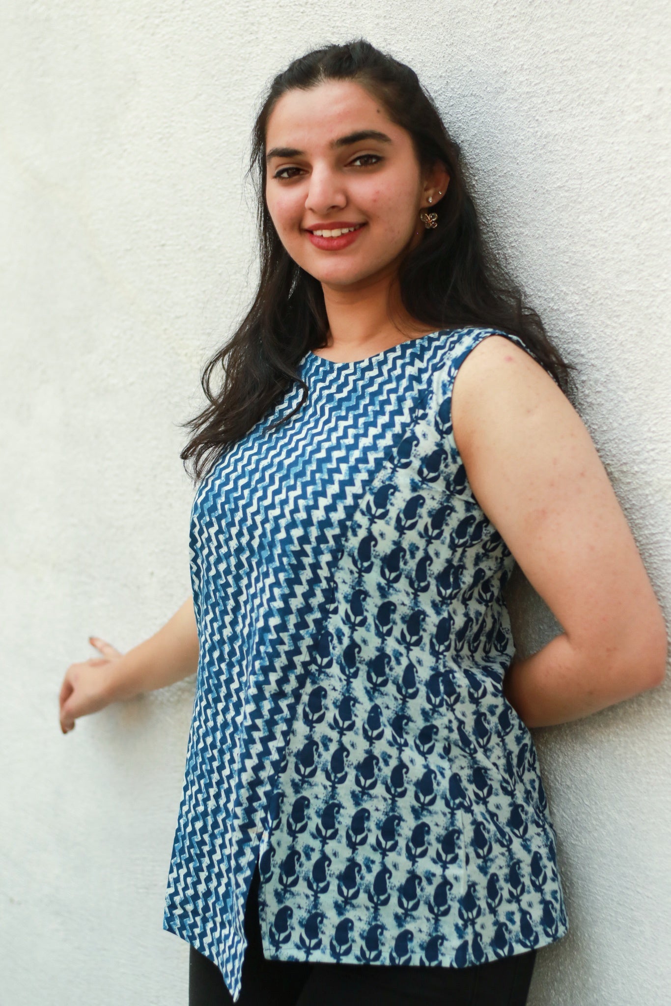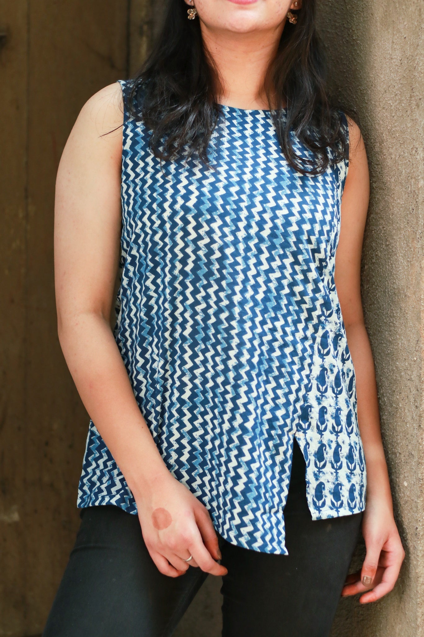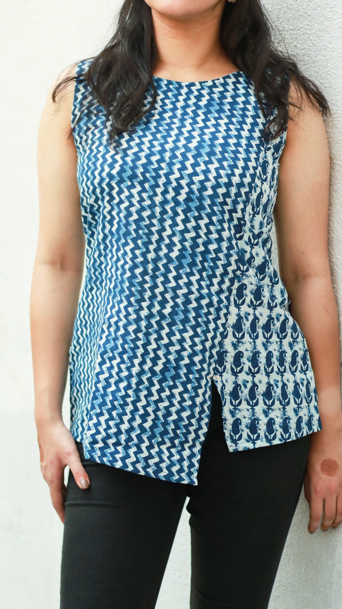 "Get ready for summer with this Indigo overlap short top - perfect for adding a stylish twist to your wardrobe. Featuring an asymmetrical cut and dual print design, this top is sure to make a statement. Indigo, a timeless and versatile color, is a must-have in any fashionista's closet."