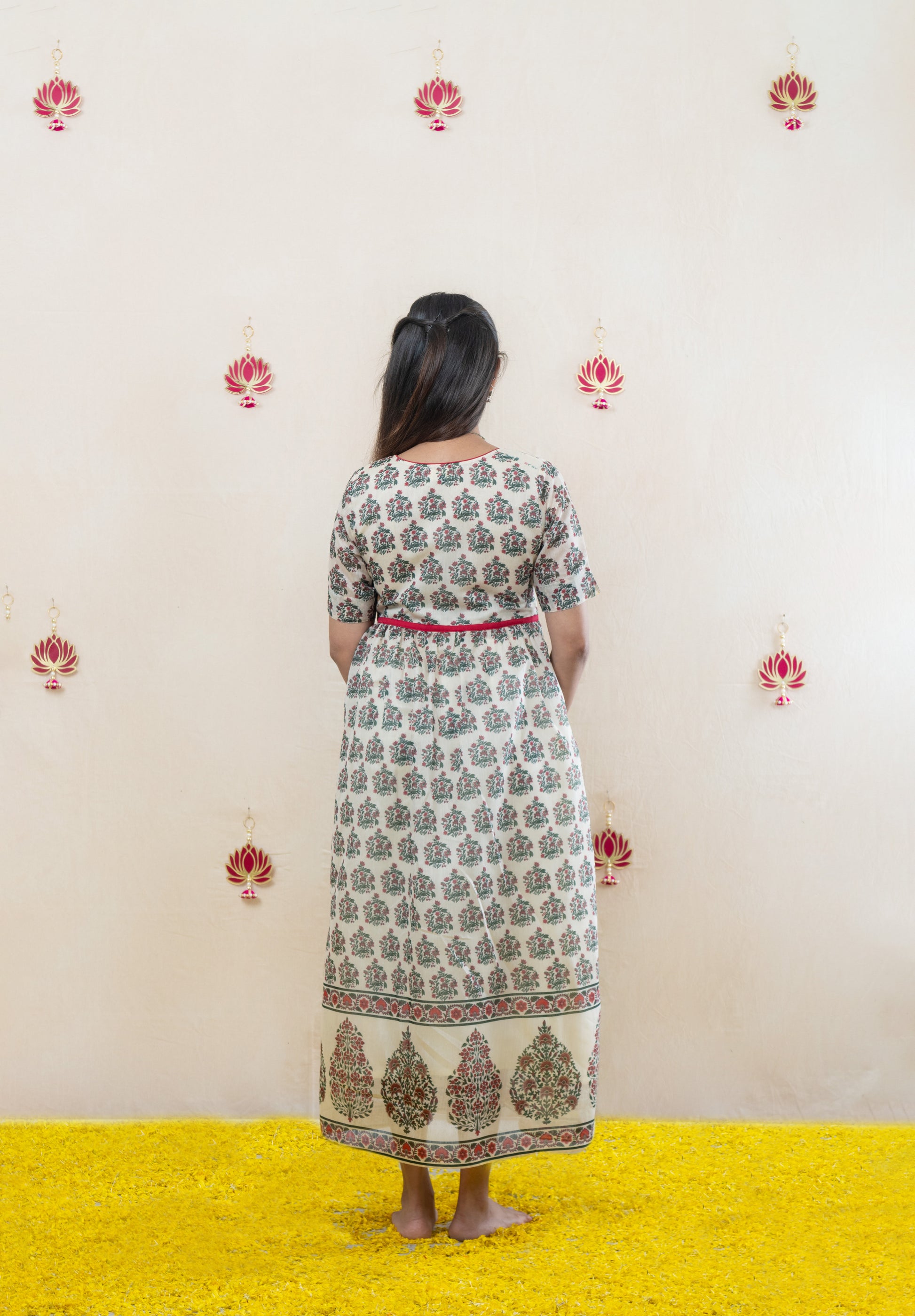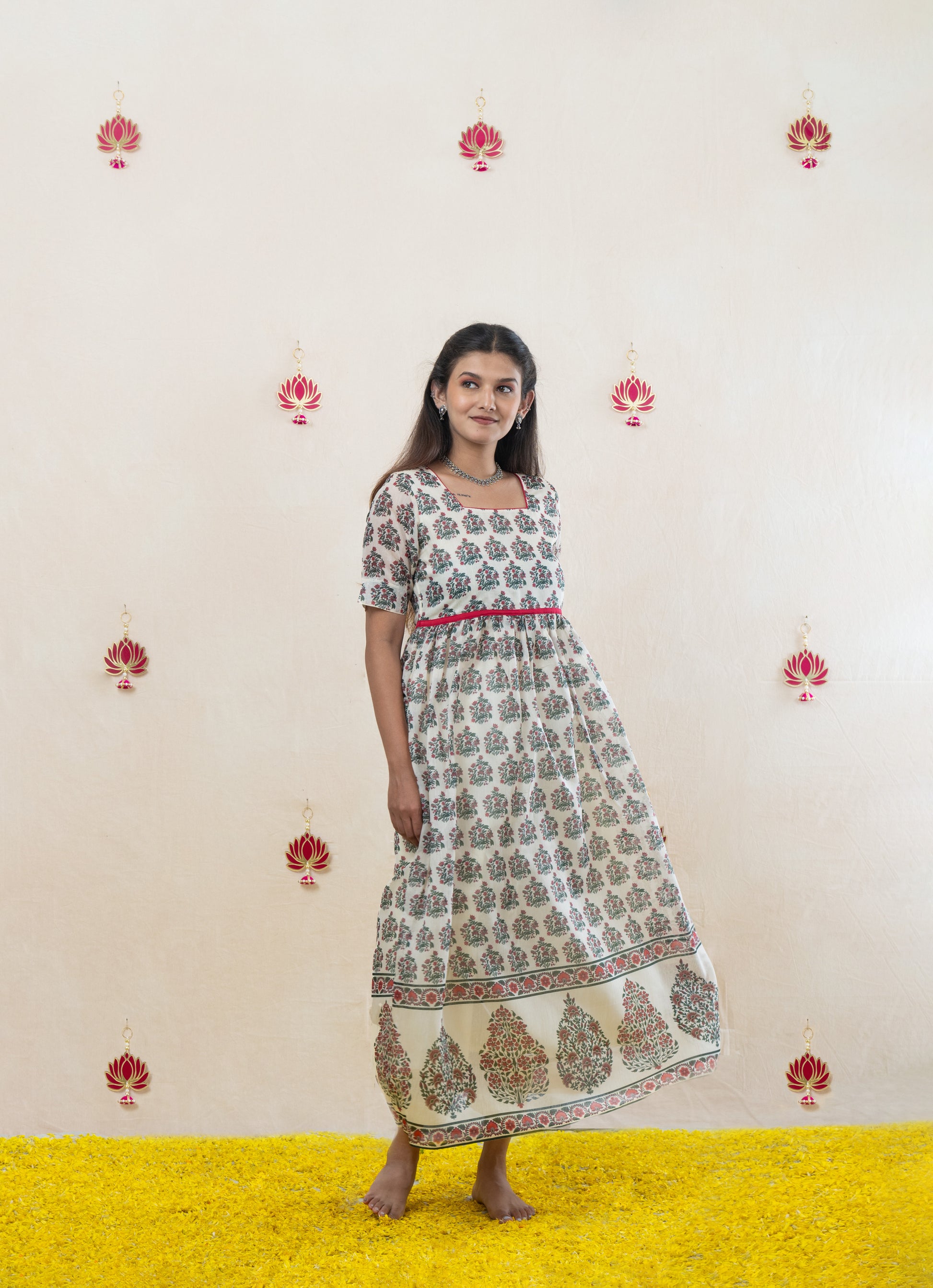 Show up to your next event in style with this white Mughal motif dress. Make a statement with the elegant print border, contrast pink piping, and subtle patti. Wow your guests and feel your most confident and chic!