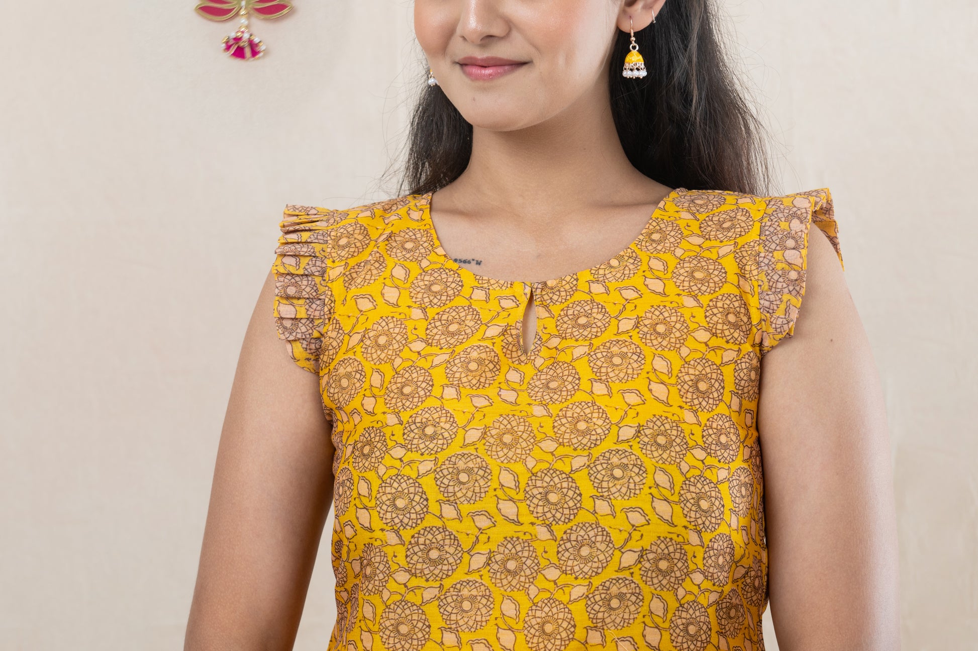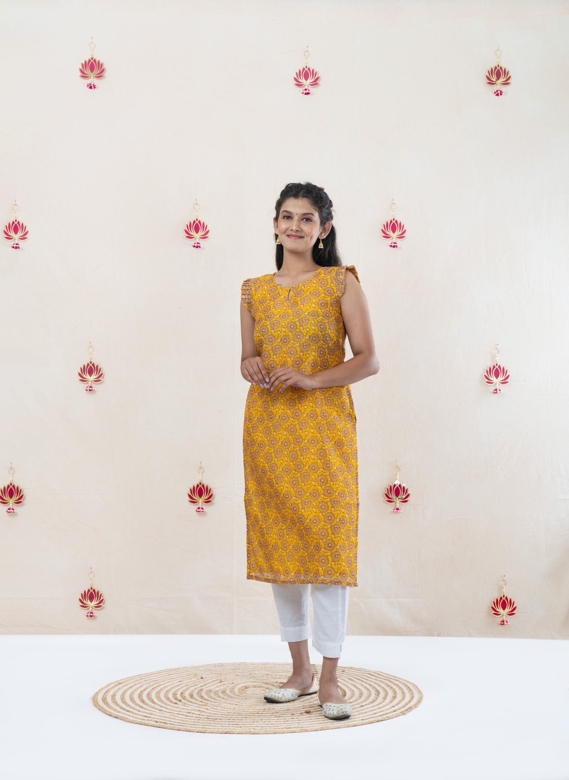 This sunny yellow chanderi kurta is a perfect way to brighten up any outfit! With playful pleats detailing at the sleeves, you'll surely stand out in any crowd. Not to mention, everyone will envy your chic and cheerful style!