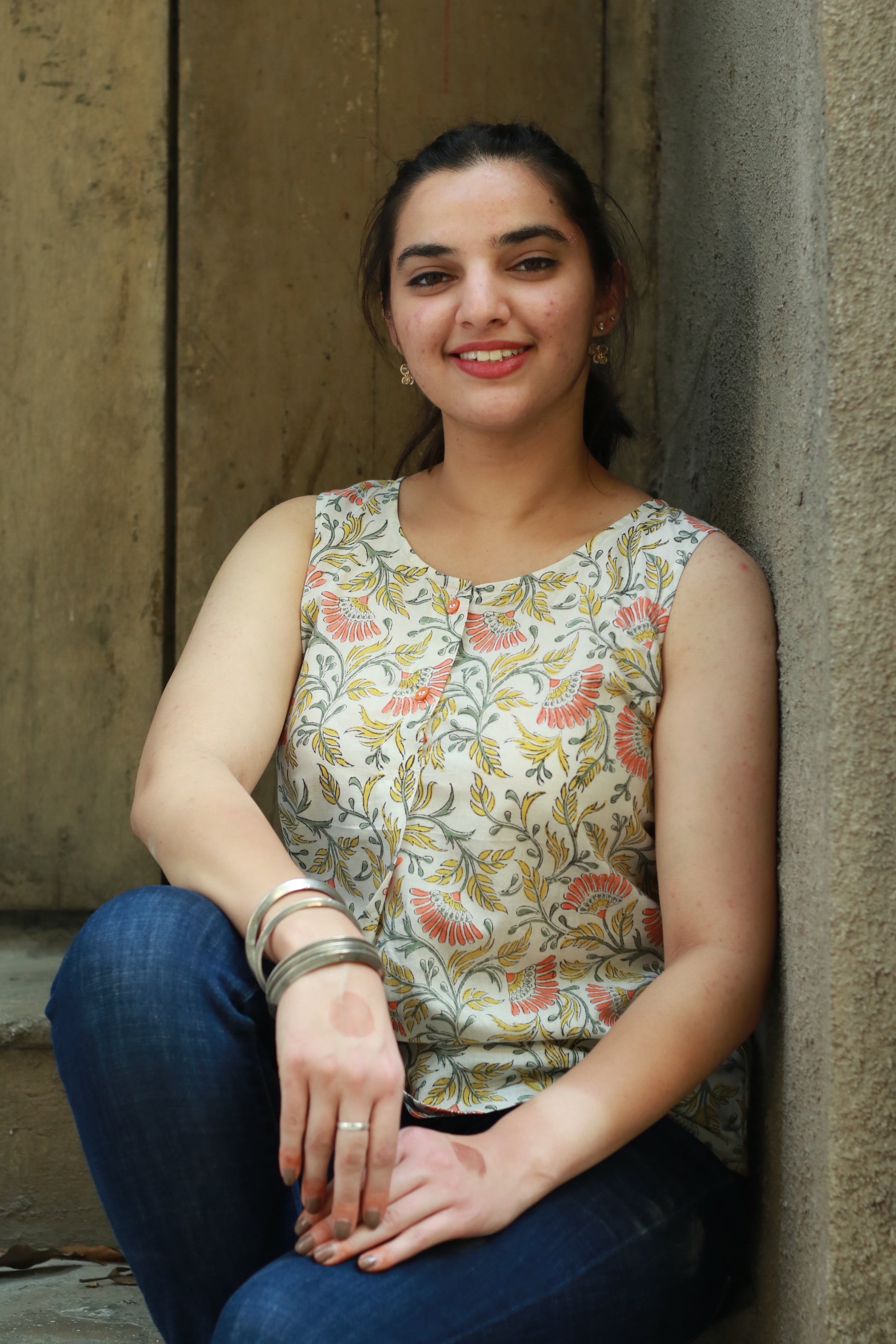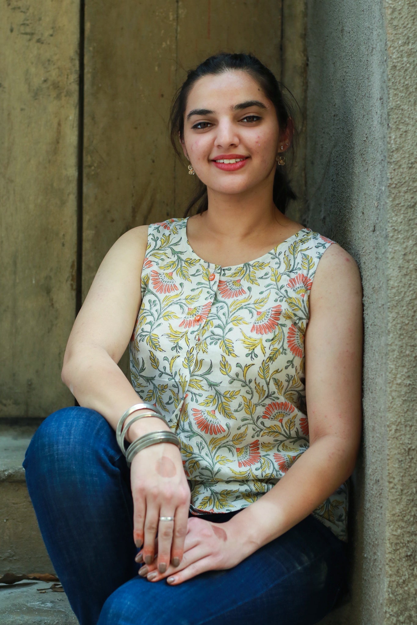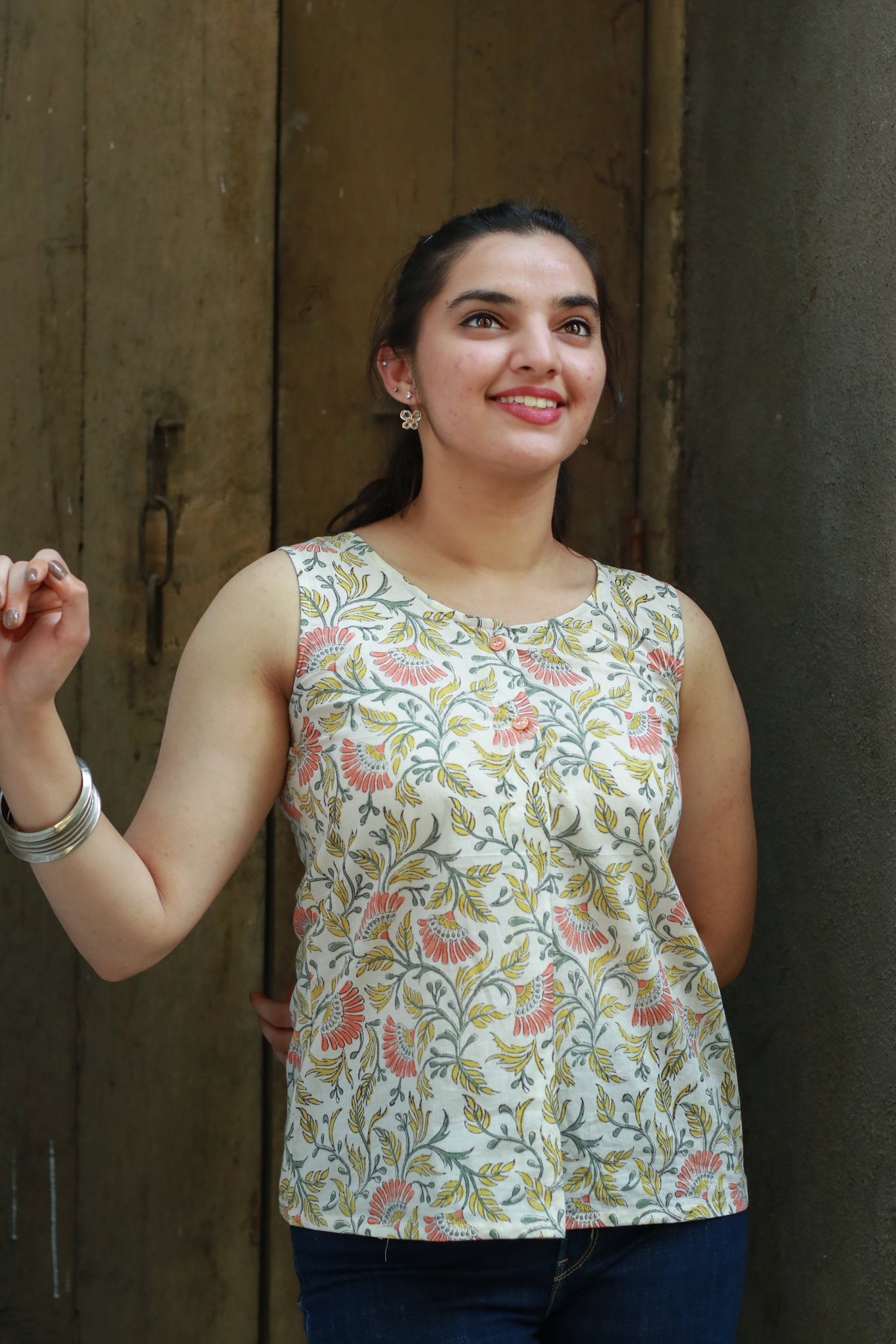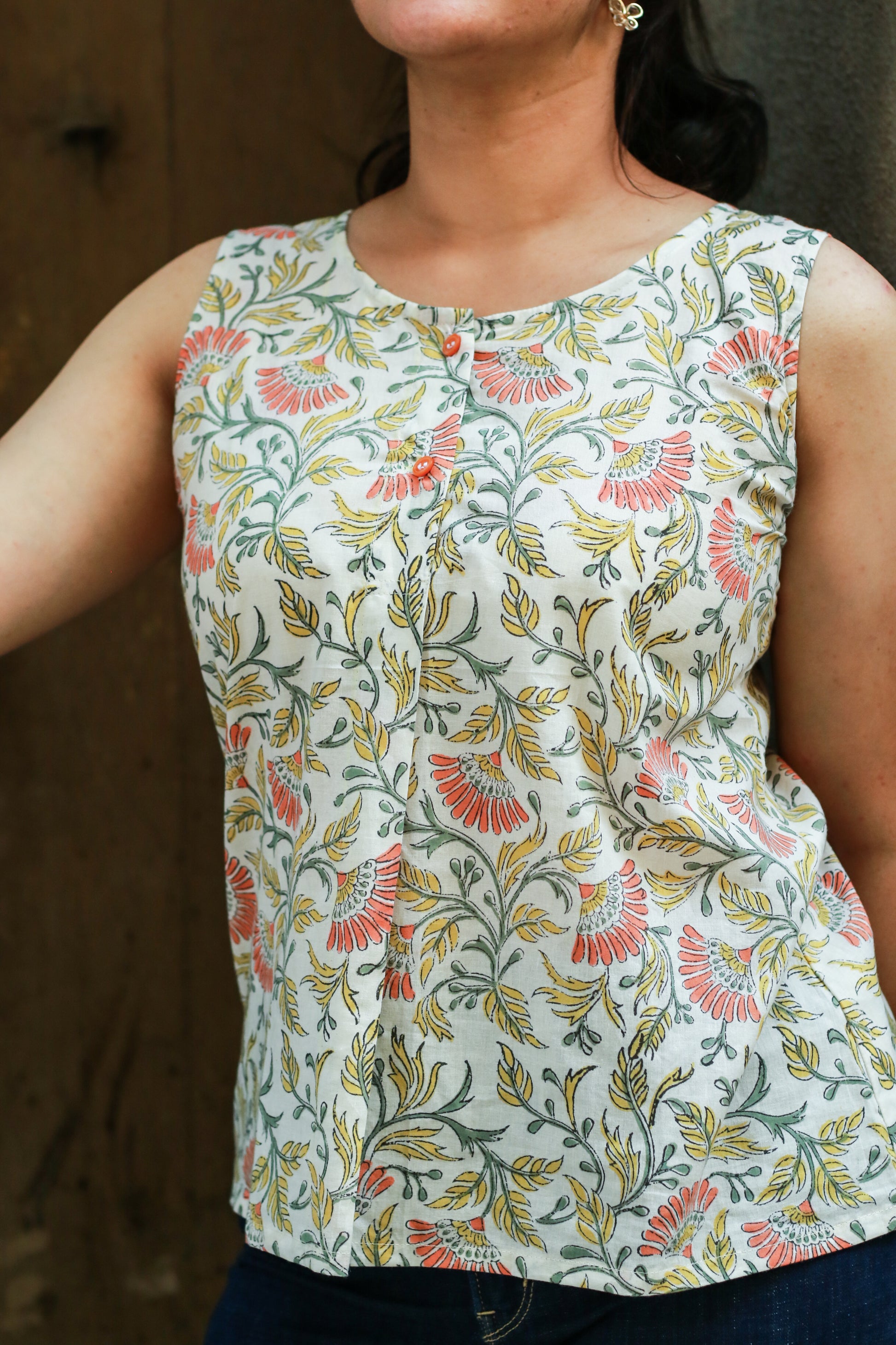 "Stay cool and stylish with our Classy block printed top. Beat the heat in this sleeveless masterpiece, featuring a unique front pleat design. A must-have for any fashion-forward individual!"