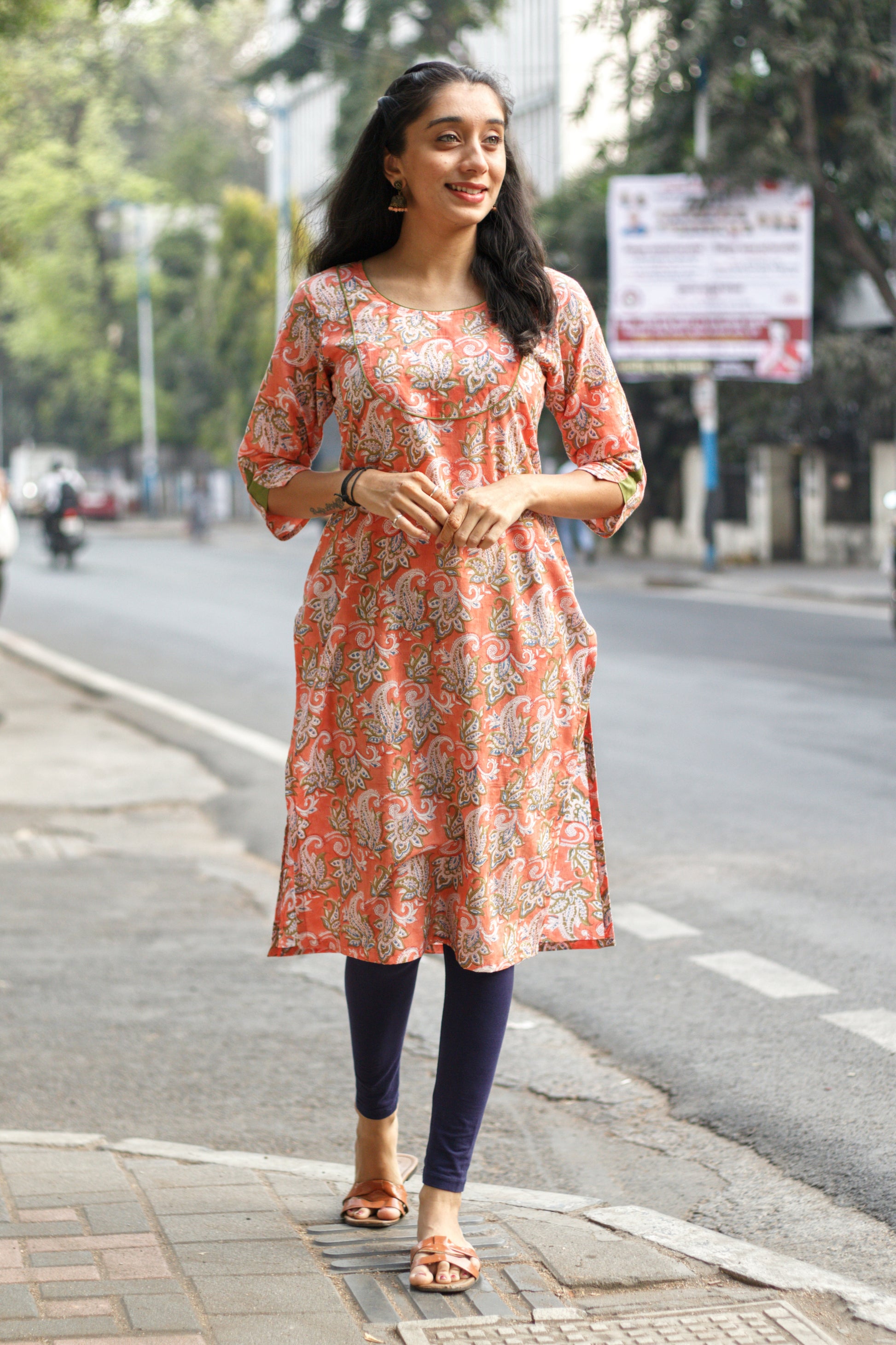 This kurta features a soft and calming orange color, making it an ideal choice for your ethnic summer wardrobe.